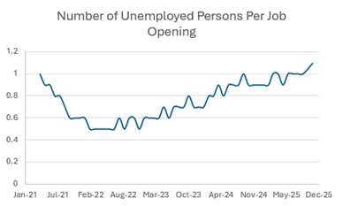 The labor market weakened but remains historically strong. Unemployment ticked down to 4.5% in December after hitting 4.6% in November, while job openings fell to 7.1 million, down nearly 900,000 year-over-year. This cooling trend reflects slower hiring and rising slack, though layoffs remain subdued.