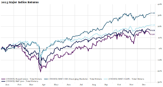 The 10-year Treasury yield ended 2025 at 4.18%, down from mid-year highs but still elevated relative to pre-pandemic norms. Emerging market debt outperformed dramatically, delivering returns near 20%, supported by a weaker dollar and improving fundamentals. We continue to maintain high-quality exposure and neutral duration in our fixed income portfolios.